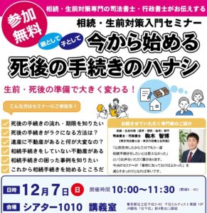 セミナータイトルは、相続・生前対策入門セミナー「今から始める死後の手続きのハナシ」です。